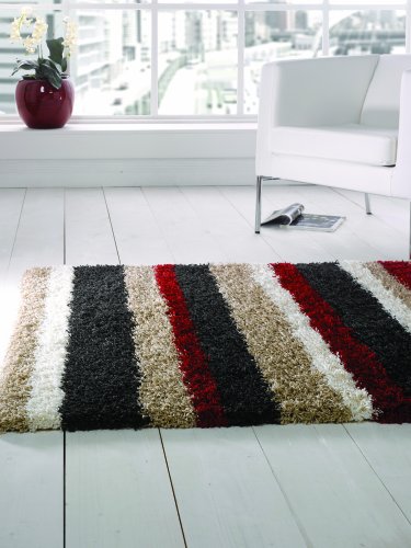 - UK Mainland postage only due to size restrictions in posatge. Nordic Channel Striped Shaggy rugs woven in Black and Red and Ivory. 3 sizes available. Non shedding 100% Polypropylene that is a deep pile.